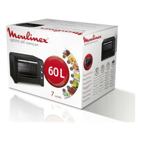 Moulinex Optimo 60l ox495. Oven net capacity: 60 l, Produktfarbe: Schwarz, Control Typ: Drehregler. Oven power: 2200 W, Anschlusswert: 2200 W. Breite: 440 mm, Tiefe: 622 mm, Höhe: 416 mm